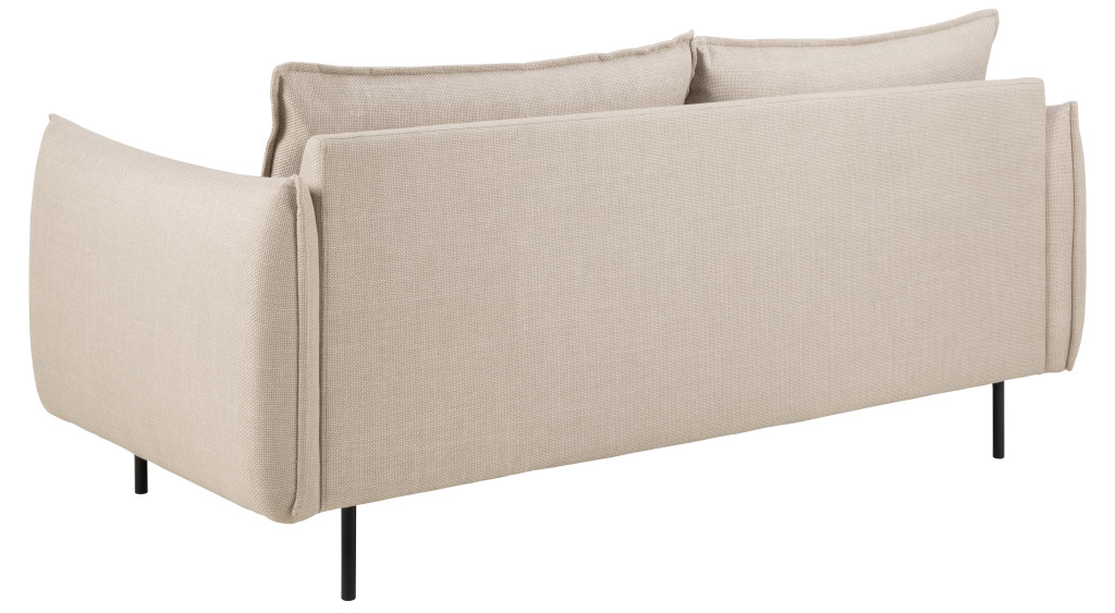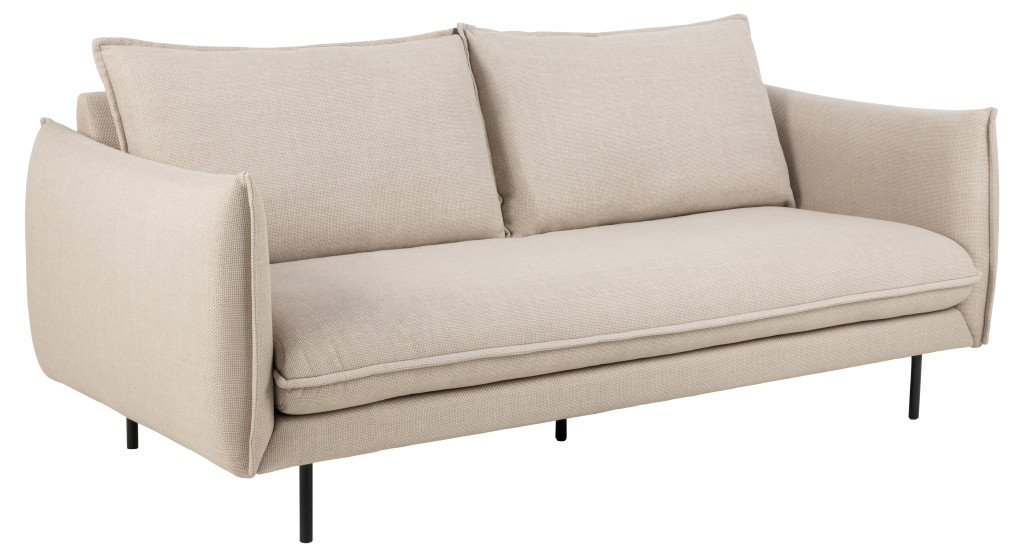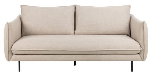Elegáns, bézs 2,5 személyes kanapé letisztult vonalakkal, kerekített kartámaszokkal és kétoldalas háttámlapárnákkal. A francia varrások és a két tónusú szövet stílusos, kifinomult megjelenést biztosítanak, fekete fém lábakkal.