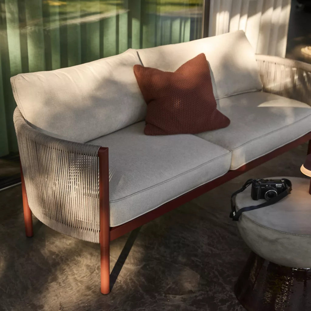 A Nerissa kerti kanapé a kültéri pihenés és baráti összejövetelek központi eleme. Homokszínű párnáival és vörösesbarna porfestett alumínium vázával harmonikusan illeszkedik a terasz vagy a kert stílusához. Tágas, kényelmes kialakítása ideális a nap első napsugarainak élvezetére vagy a csillagos estékhez, miközben elegáns, nyugodt hangulatot teremt a szabadban.