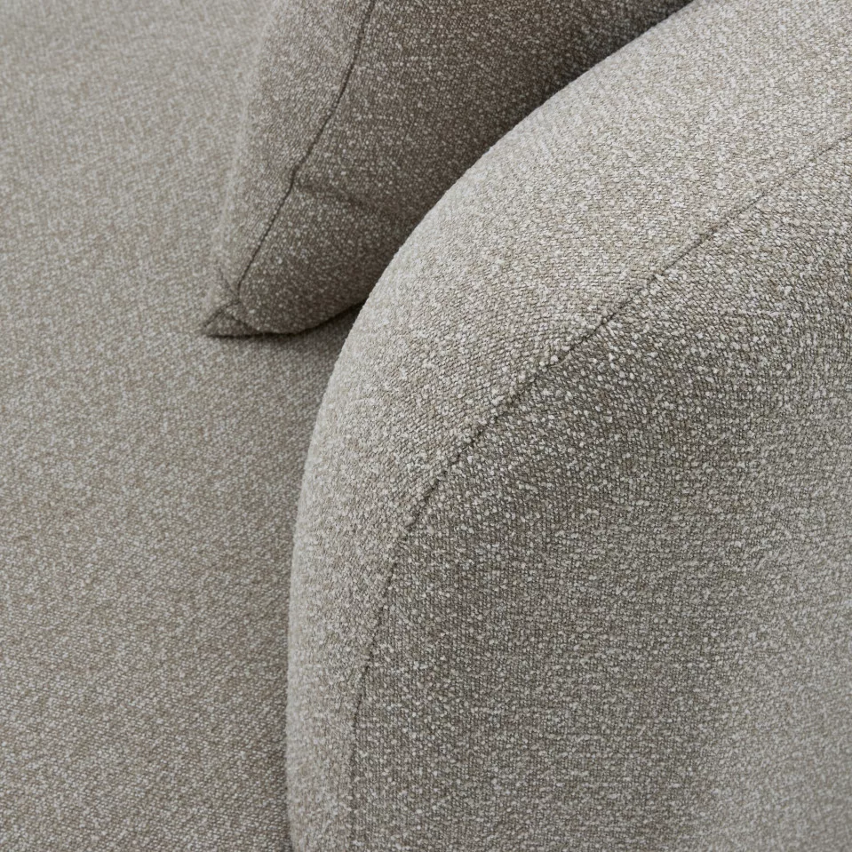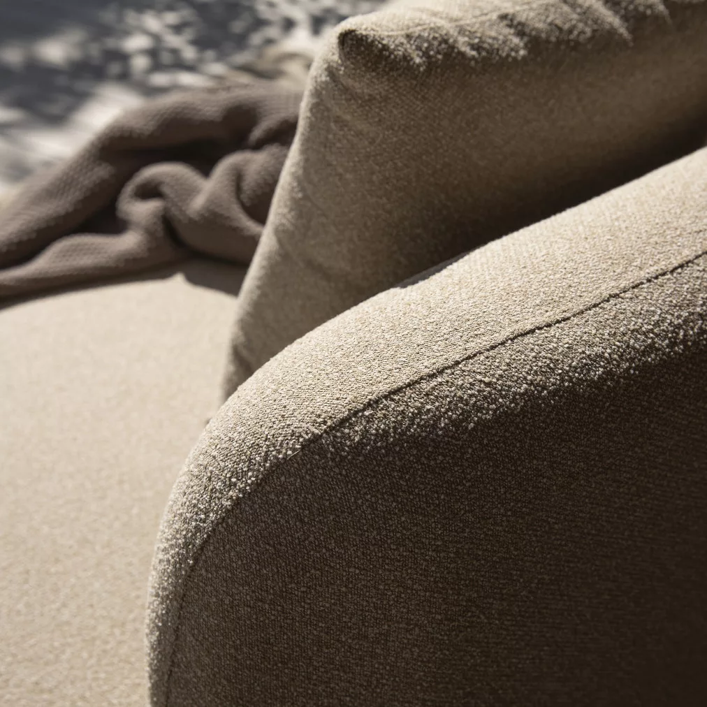 Az Olina kerti kanapé a kültéri pihenés és nyugalom központja. Puha, organikus formája és mély ülőfelülete azonnal meghív a kikapcsolódásra. A párnák gyorsan száradó habszivacs töltete lehetővé teszi, hogy a rövid nyári záporok se zavarják a pihenést, míg az időjárásálló textilek hosszú távon is szépek maradnak. Elegáns, fa hatású lábai és modern kialakítása harmonikusan illeszkedik minden teraszra vagy kertbe.