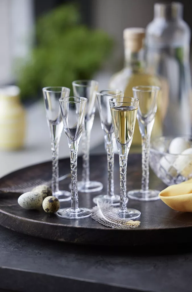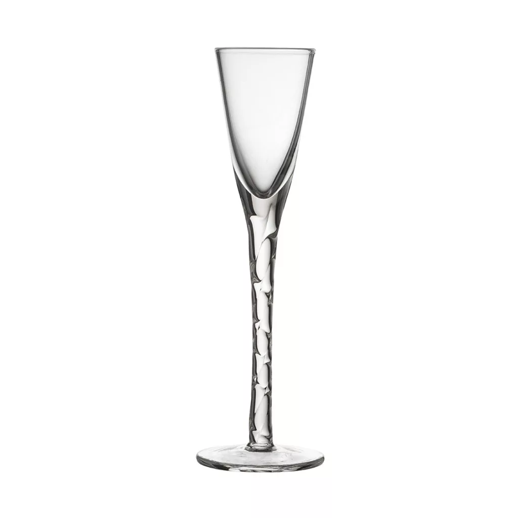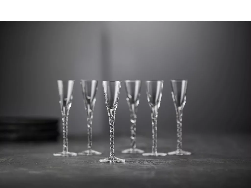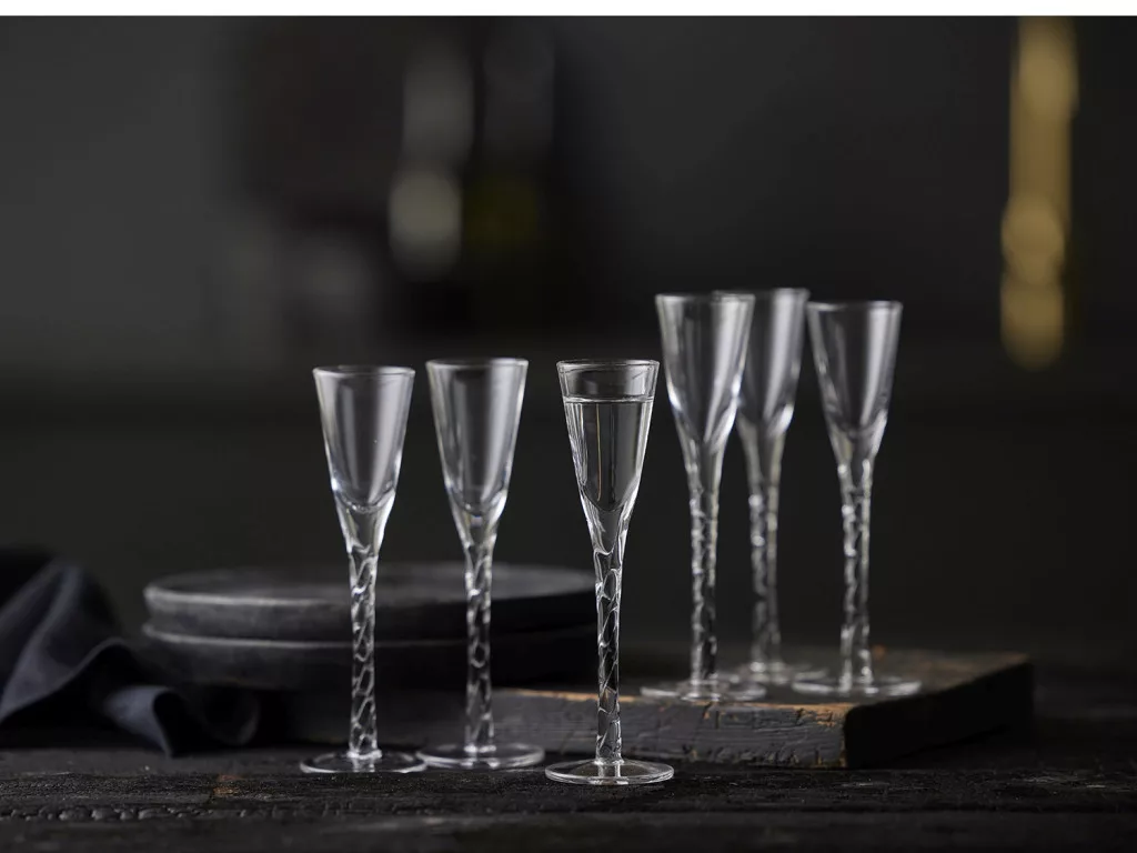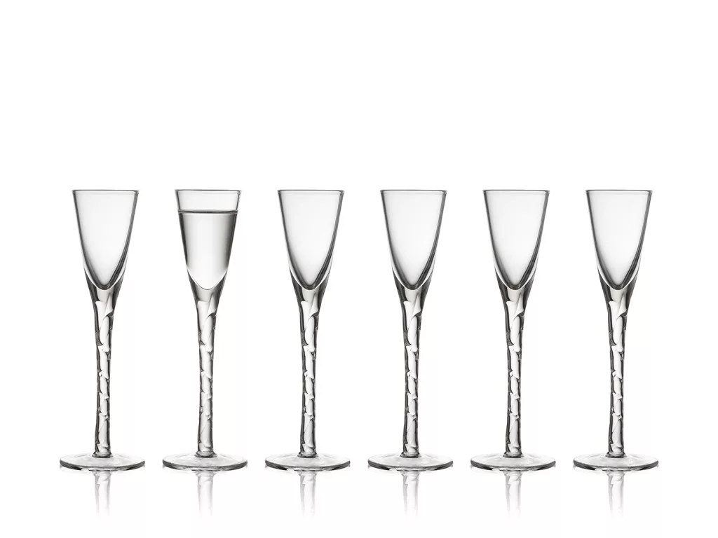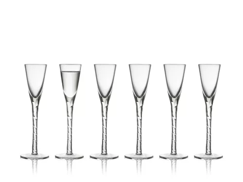 Hat darab kézzel készített, fújt pálinkás pohár kézzel csavart szárakkal, 2,5 cl űrtartalommal, amelyek barátságos hangulatot teremtenek az asztalnál.