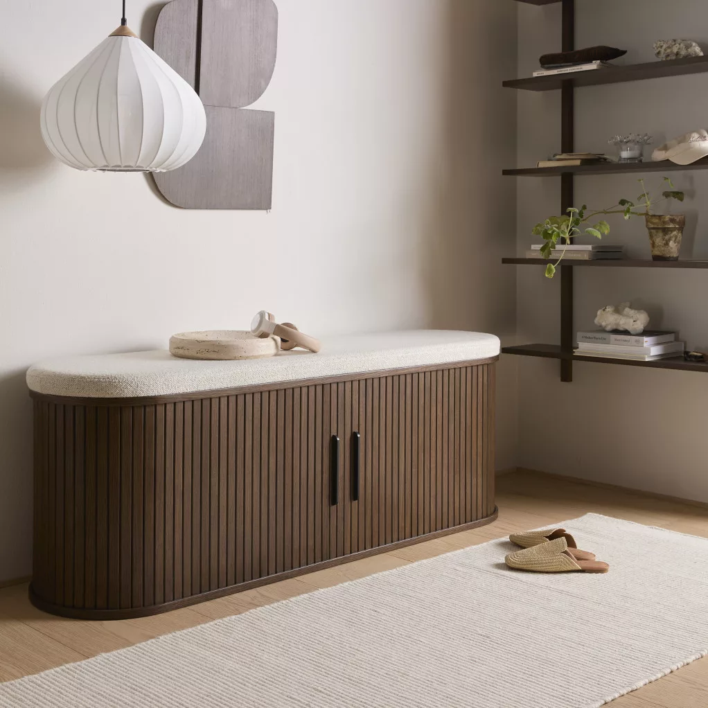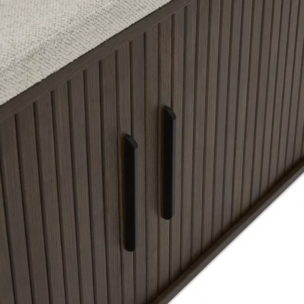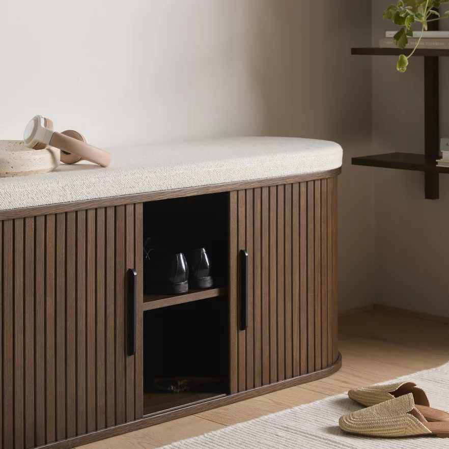 A Winston cipőpad eleganciát és rendet visz a mindennapokba. Tömör, matt füstszínű tölgyfa és fehér szövet kombinációja meleg, harmonikus hangulatot teremt az előszobában vagy hálószobában, miközben a két mozgatható polc és ajtó rendszere segít áttekinthetően tárolni a cipőket és kiegészítőket.