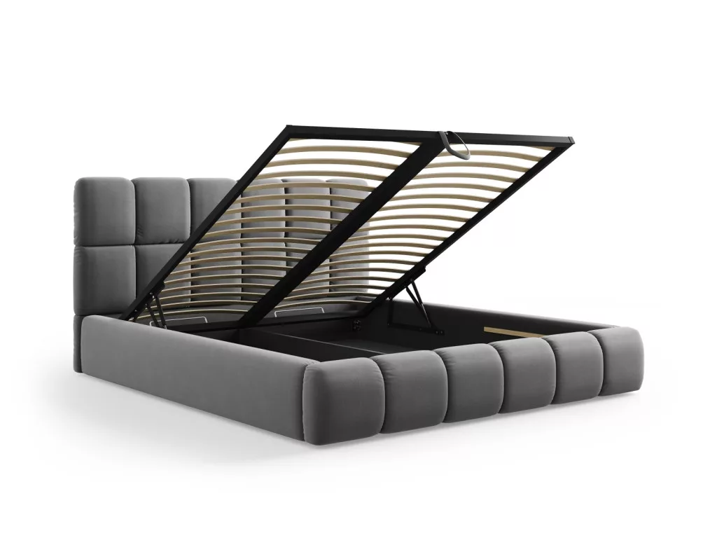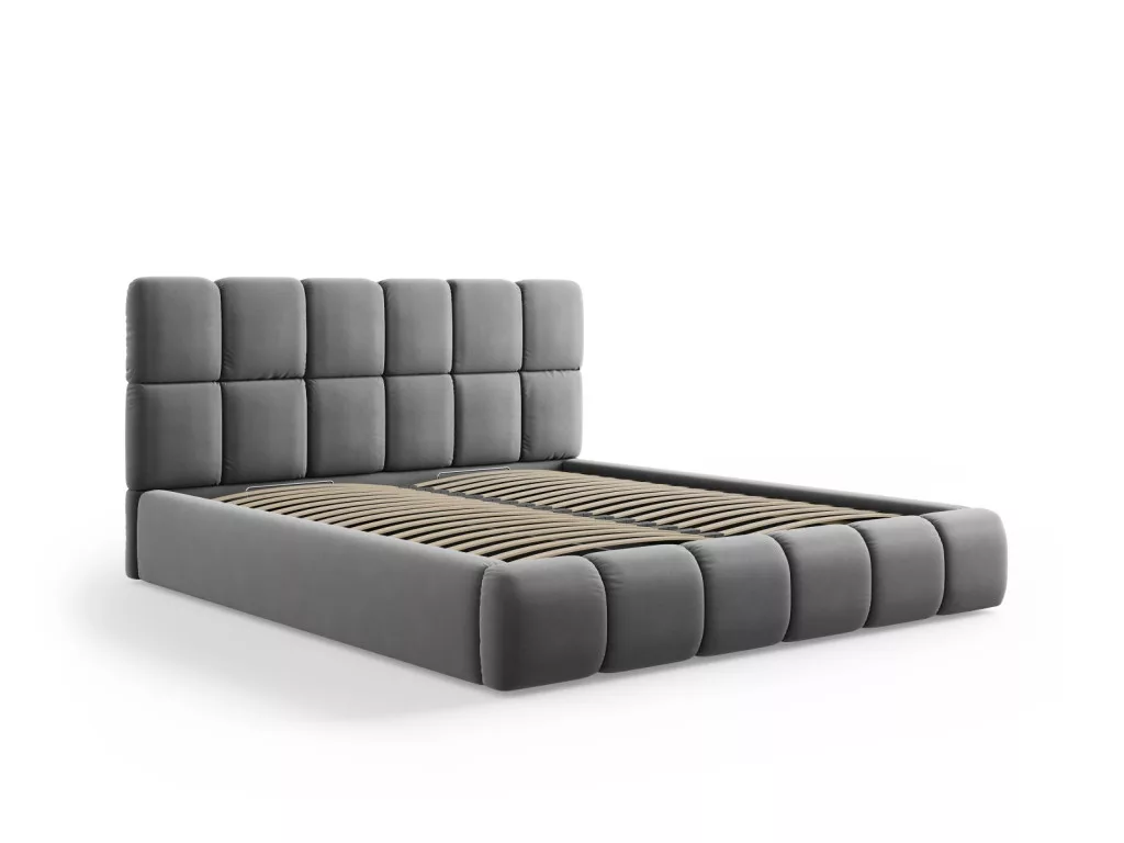 The Bellis double bed is the ideal choice for those who want unique and stylish furniture for their bedroom. The trendy rounded silhouette and soft headboard and frame padding ensure maximum comfort for every moment of relaxation. The spectacular stitching results in a stable and flexible filling that ensures the shape and comfort of the bed in the long term. The delicately rounded cube shapes exude elegance, while the bold design adds character to the bedroom. The Bellis double bed has a spacious storage compartment, which is ideal for organizing bedding and textiles. The bed is sold without a mattress, bedding, or decoration, allowing you to arrange the bedroom according to your own style. The built-in Gas Lift mechanism and metal-framed flexible slat structure ensure practical and comfortable use.