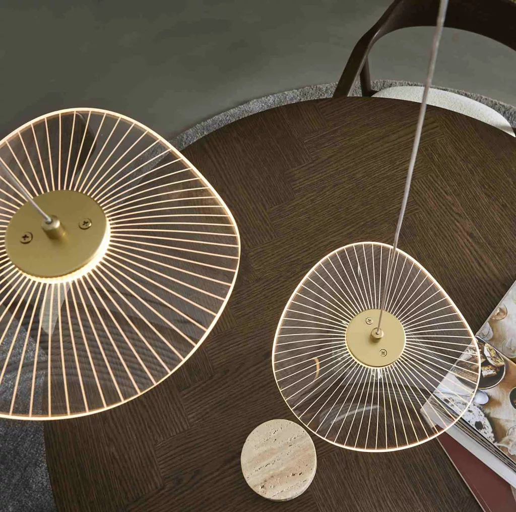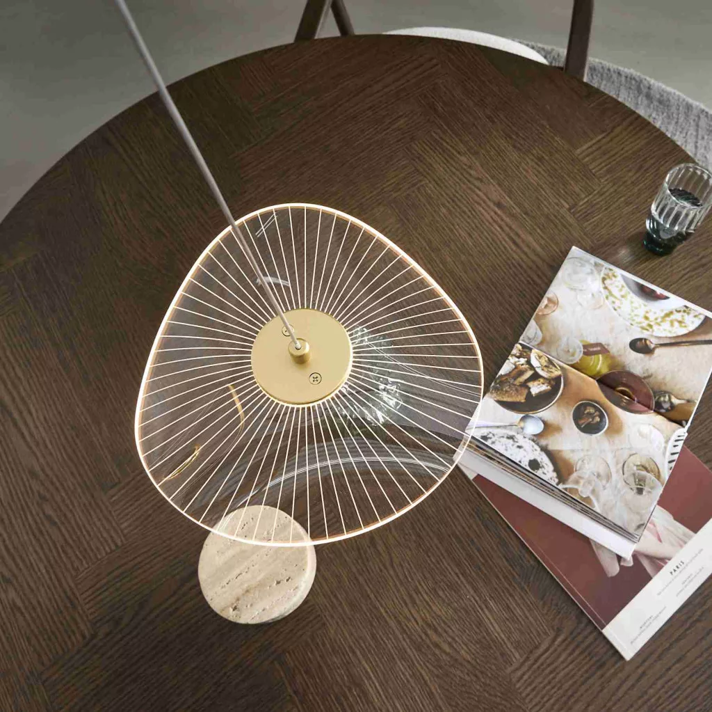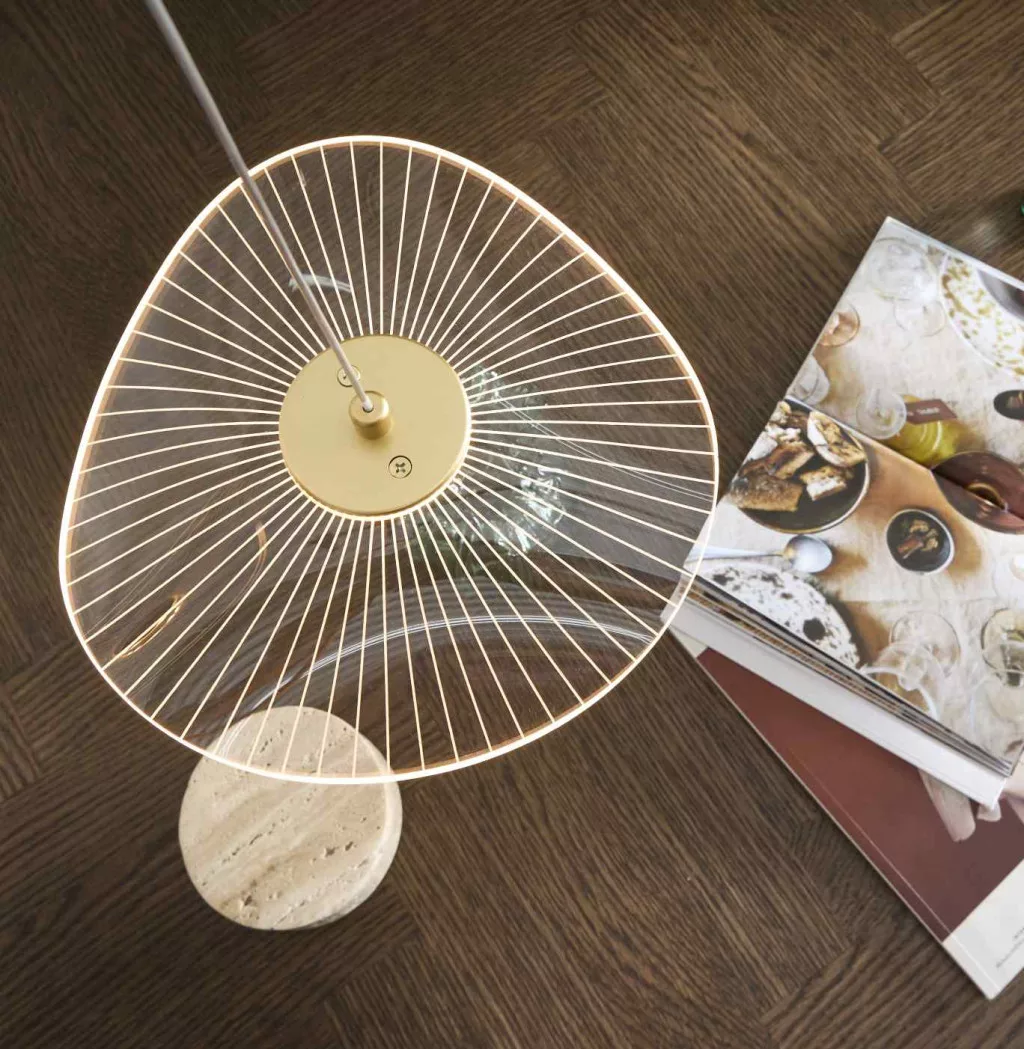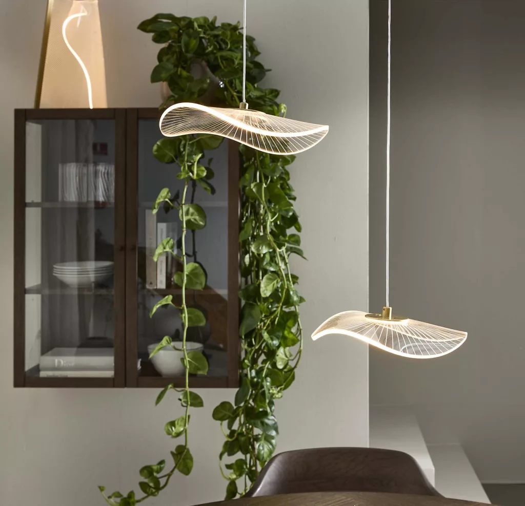 The CURTSY pendant lamp is made of clear acrylic, with a clean design and a transparent cable. Its sophisticated appearance creates a vibrant light effect, ideal for small spaces or as decorative lighting above a kitchen island.