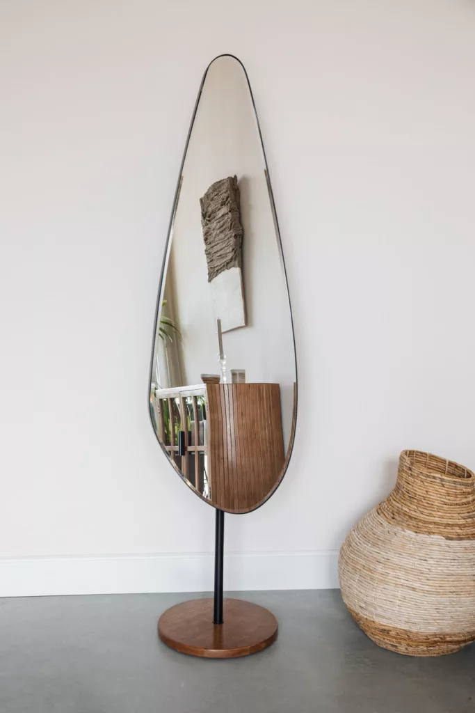A Zuiver Dropz tükör egy lenyűgöző dizájnú álló tükör, amely tökéletes választás modern, ipari vagy minimalista stílusú belső terekhez. A 135 cm magas, 40 cm széles és 35 cm mély tükör fekete fémkerettel és sötétbarna lakkozott fa talppal rendelkezik, amely eleganciát és stabilitást biztosít. Ez a tükör nemcsak praktikus, hanem műalkotásszerű kiegészítője is lehet otthonának, amely vizuálisan tágítja a teret és fényt hoz a helyiségbe. Ideális előszobákba, hálószobákba vagy nappalikba, ahol a dizájn és a funkcionalitás egyaránt fontos szerepet kap.