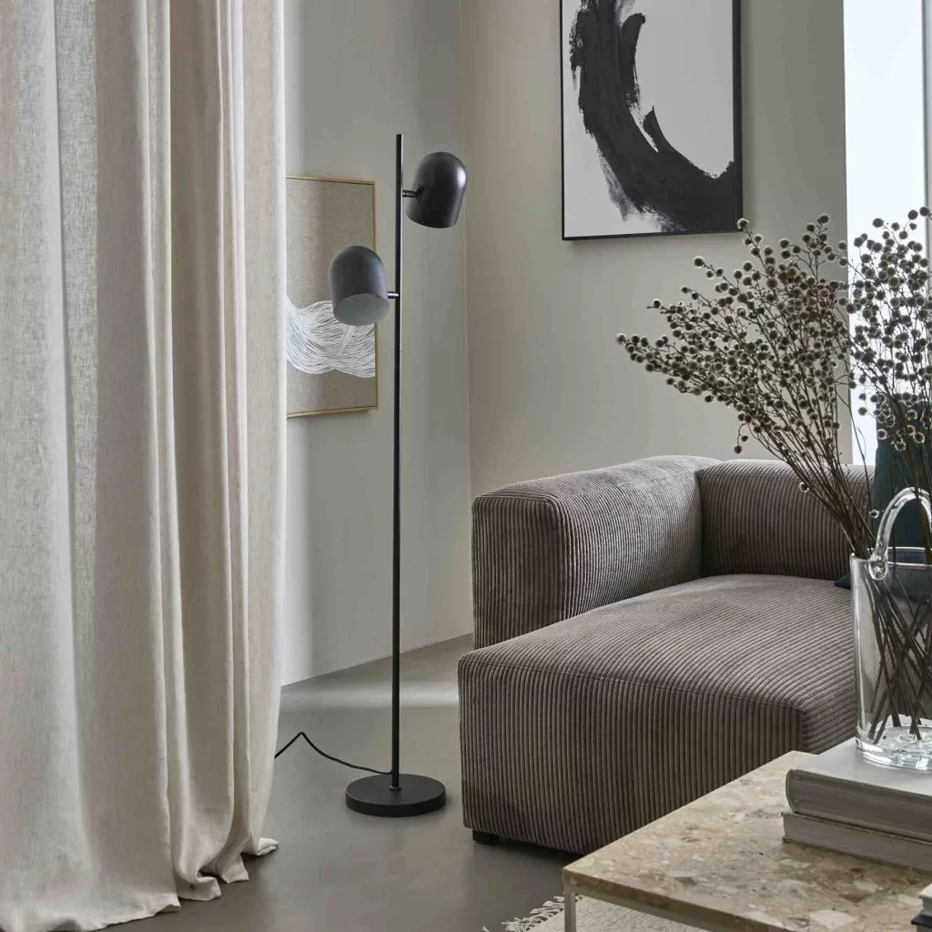 Ez a fekete fém búrás és talpú állólámpa a letisztult minimalizmus jegyében készült, így ideális, ha olyan lámpát keresel, ami egyszerre funkcionális és stílusos. A fekete textilkábel harmonikusan egészíti ki az összhatást, miközben a lámpa kellemes, irányított fényt biztosít. Használd olvasólámpaként a kanapé mellett vagy emelj ki vele egy különleges sarkot a nappaliban vagy a hálószobában, ahol a lágy fény hangulatos atmoszférát teremt.