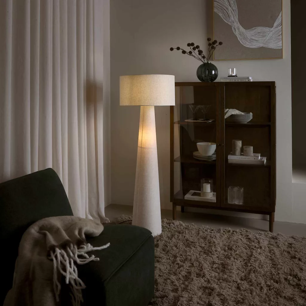 Floor lamp with a natural textile shade and a black textile cable. A clean look and soft light, perfect for next to the sofa, in a reading corner or in the bedroom.