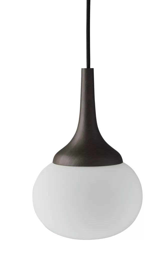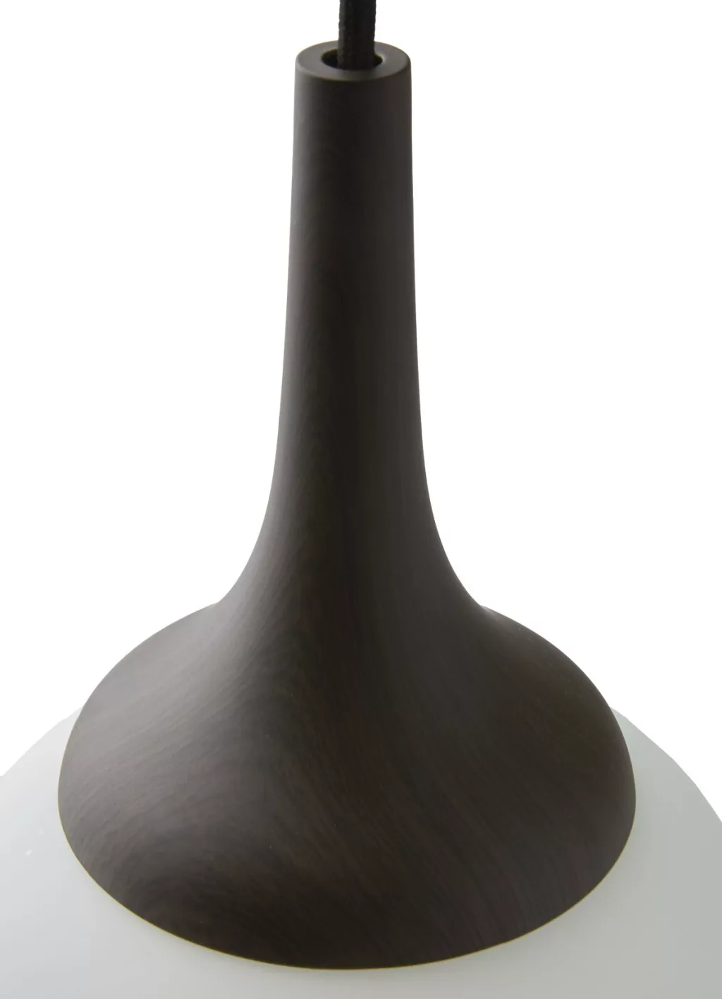 The HOLME pendant lamp has an opal white glass shade, a walnut-effect top and a black textile cable. It provides a soft, warm light, perfect for illuminating a dining table, kitchen counter or corner of a room.