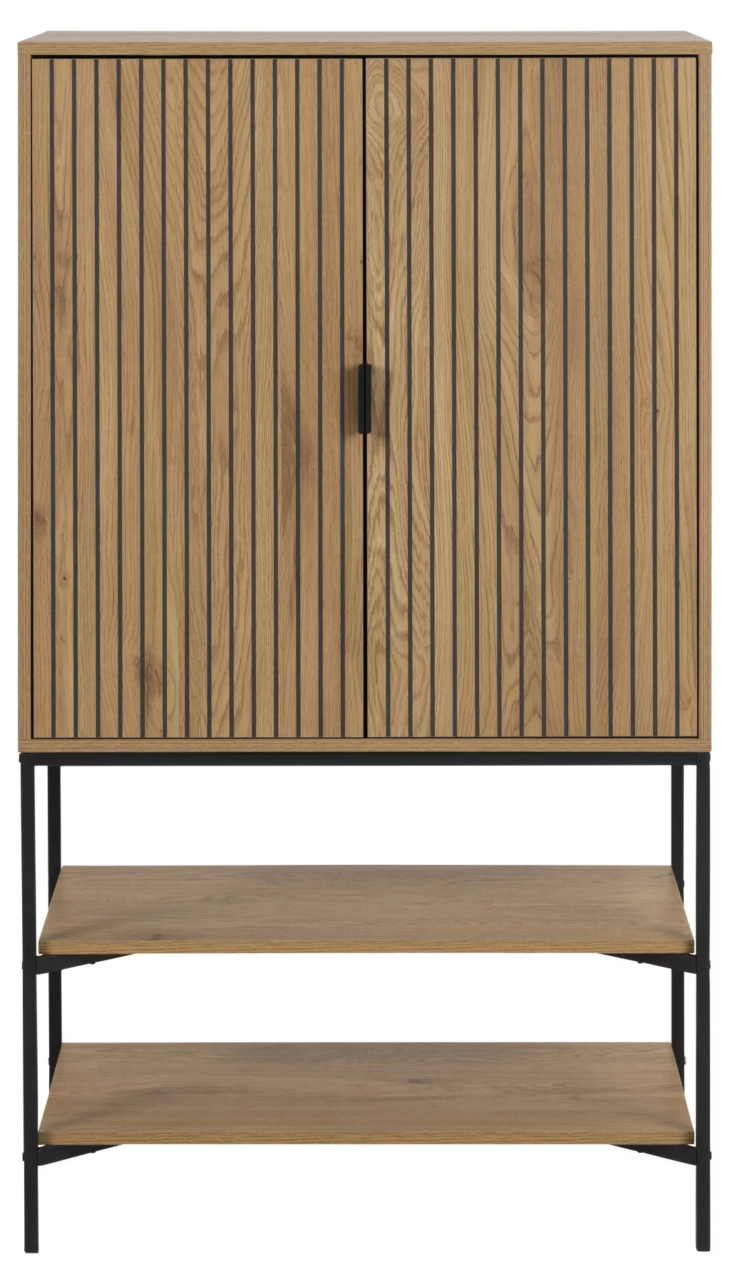 The Japura cabinet, with its minimalist look and wild oak-effect surface, is a true statement piece in your home. This modern cabinet measures 80 cm x 40 cm x 140 cm stands on a matt black steel frame, and features a slatted-pattern door front. Two doors and three internal shelves provide ample space for storage. The contrast between the slatted front and the black metal elements is perfect for both Scandinavian and industrial-style interiors. Choose the Japura!
