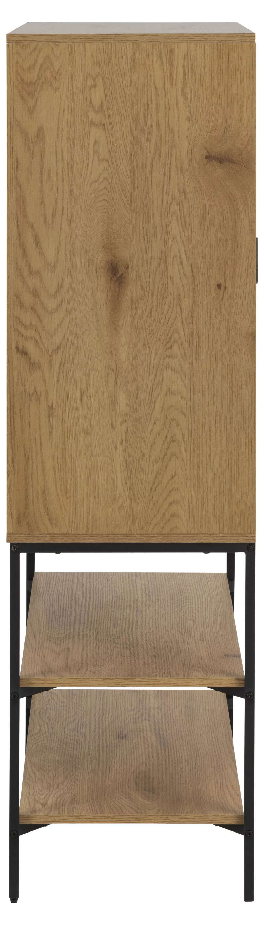 Solve your organisation challenges with the ample storage space: Behind the two doors are three shelves, which can comfortably hold all your small items. The easy-to-clean surface facilitates maintenance in the long run. The black metal handles and the steel base provide a solid frame for the wild oak-effect slats. The Jaipur cabinet is the perfect choice if you are looking for a stylish, timeless piece of furniture that is also a practical storage solution.