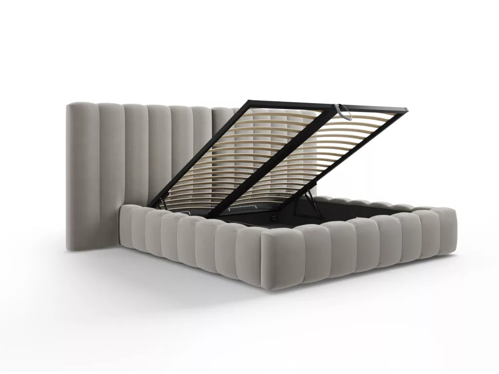 The Kelp bed stands out with its elegant shape and striking stitching. Its soft headboard provides comfortable support, the large bedding compartment offers practical storage, and the mattress can be purchased separately.