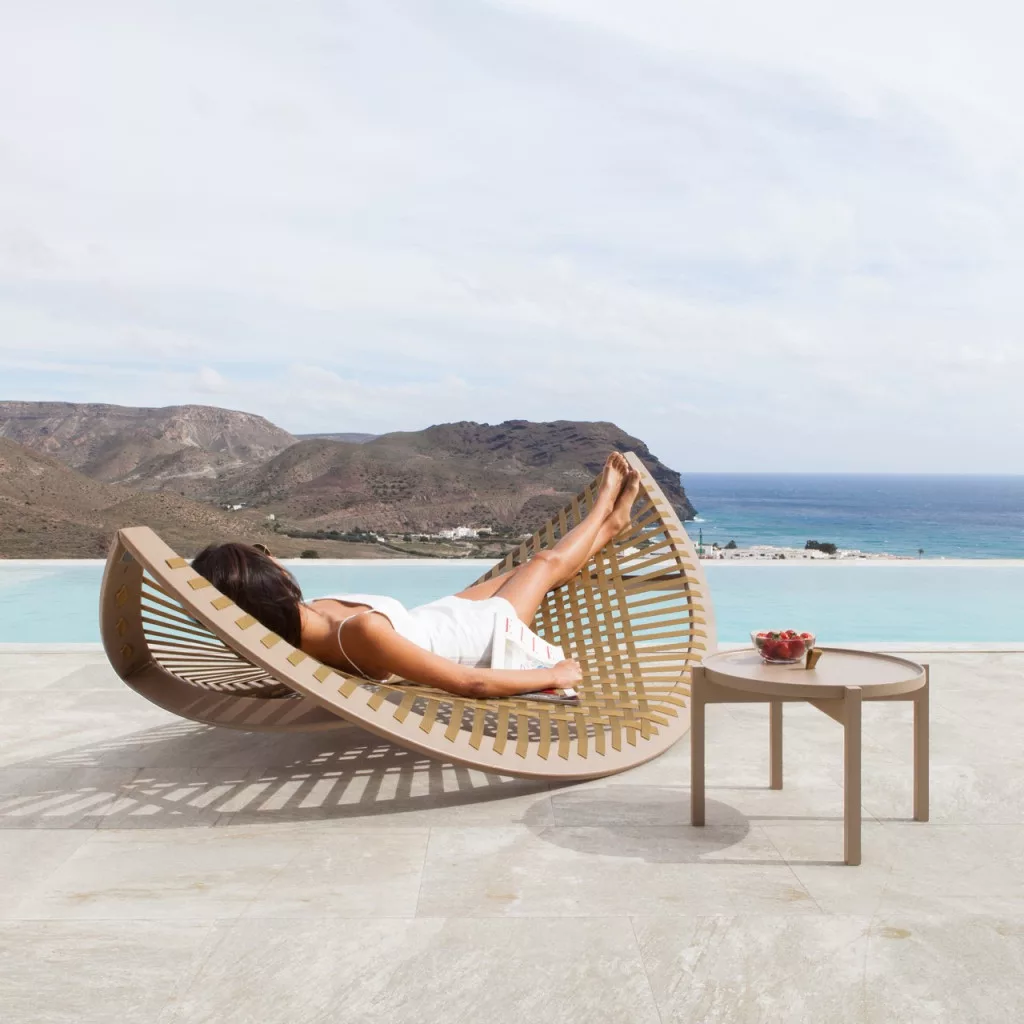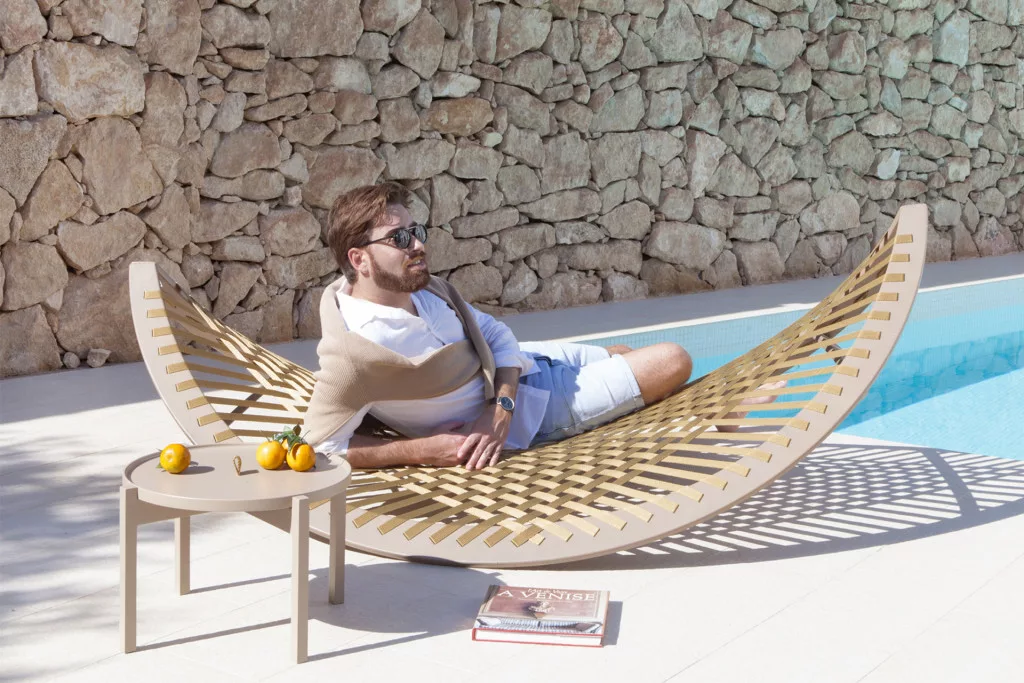 A napozóágy formavilágát a tengerparti elemek – például a szörfdeszkák és hajók – lágy, ívelt vonalai ihlették. A köteles kialakítás nyitott szerkezetet ad, amely lehetővé teszi a levegő szabad áramlását, így használat közben hűsítő érzetet biztosít. Az ergonomikus kialakítás enyhén megemeli a lábakat, ezáltal elősegíti a teljes test ellazulását és a kényelmes pihenést.