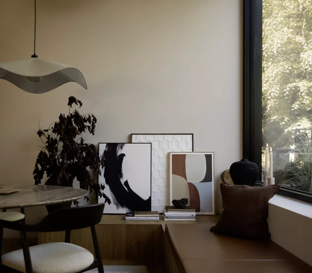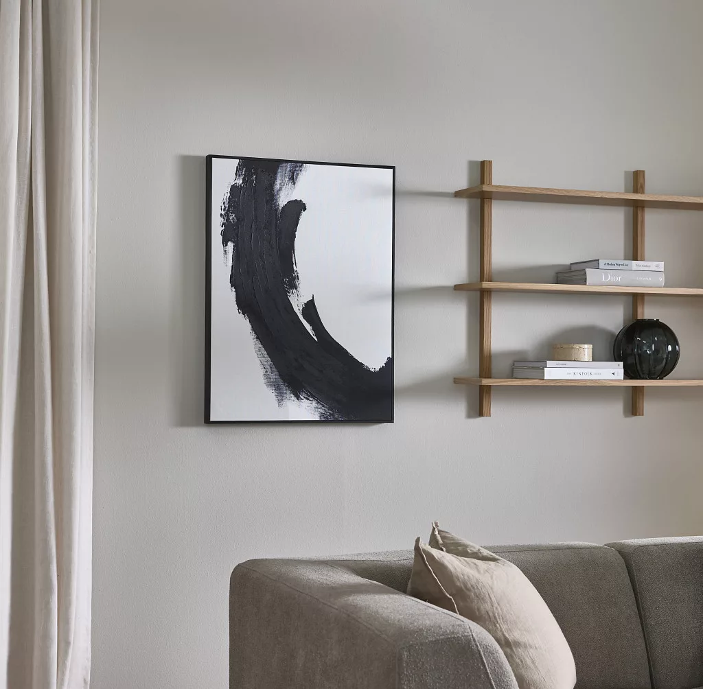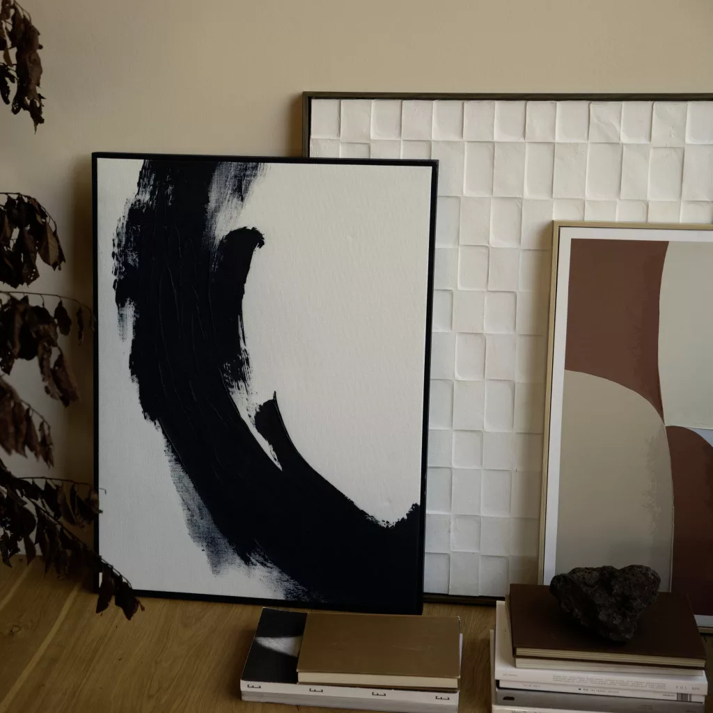 Modern canvas print with a black pattern and black frame. A characterful, contrasting wall decoration that fits perfectly into a clean, contemporary interior.