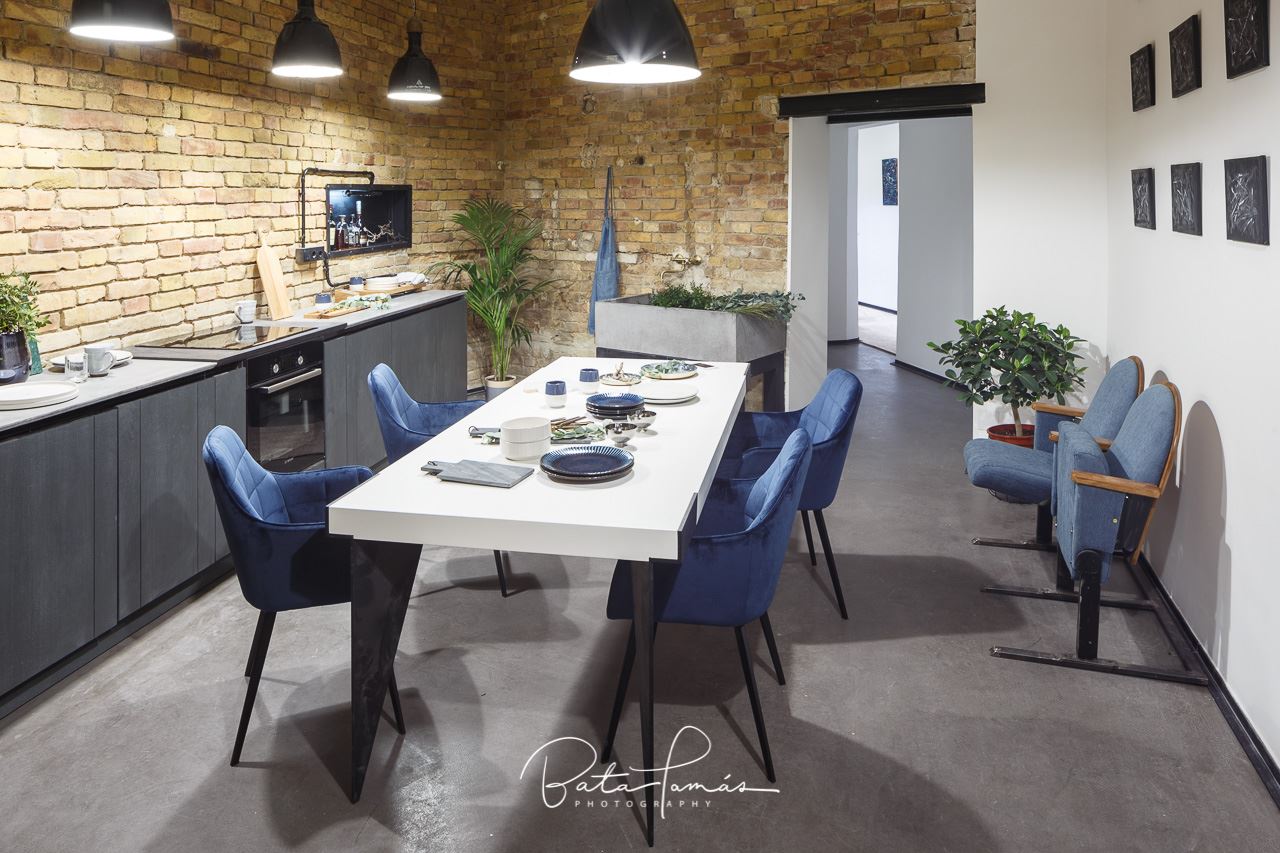 The cognac-colored leather-upholstered Shell armchair is also a standout piece, and its color perfectly matches the space, resonating with the tone of the brick wall. The indoor plants, rugs, and pallet bed bring a homely and youthful vibe to the room. The separate kitchen, with its brick walls, grey concrete-like furniture, and flooring, has a very modern look, which is balanced by the greenery and the blue velvet Embrace chair. The two comfortable sofas, the bright space, and the occasional splashes of color make this Bem Square apartment a unique and inviting home.