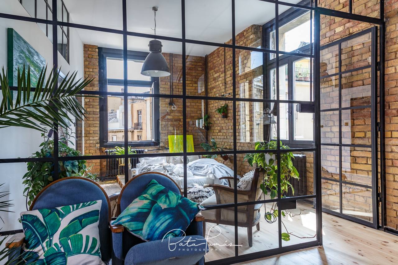 The metal details, such as the doors, lamps, and other black metal accessories, are balanced by the wooden flooring and the use of various fabrics. The mix of different furniture styles—combining theater chairs, modern pieces, and more classical furniture and accessories—creates an eclectic yet well-coordinated interior. A swing chair, reminiscent of a metal birdcage, mounted on the ceiling, adds a playful touch to the space.