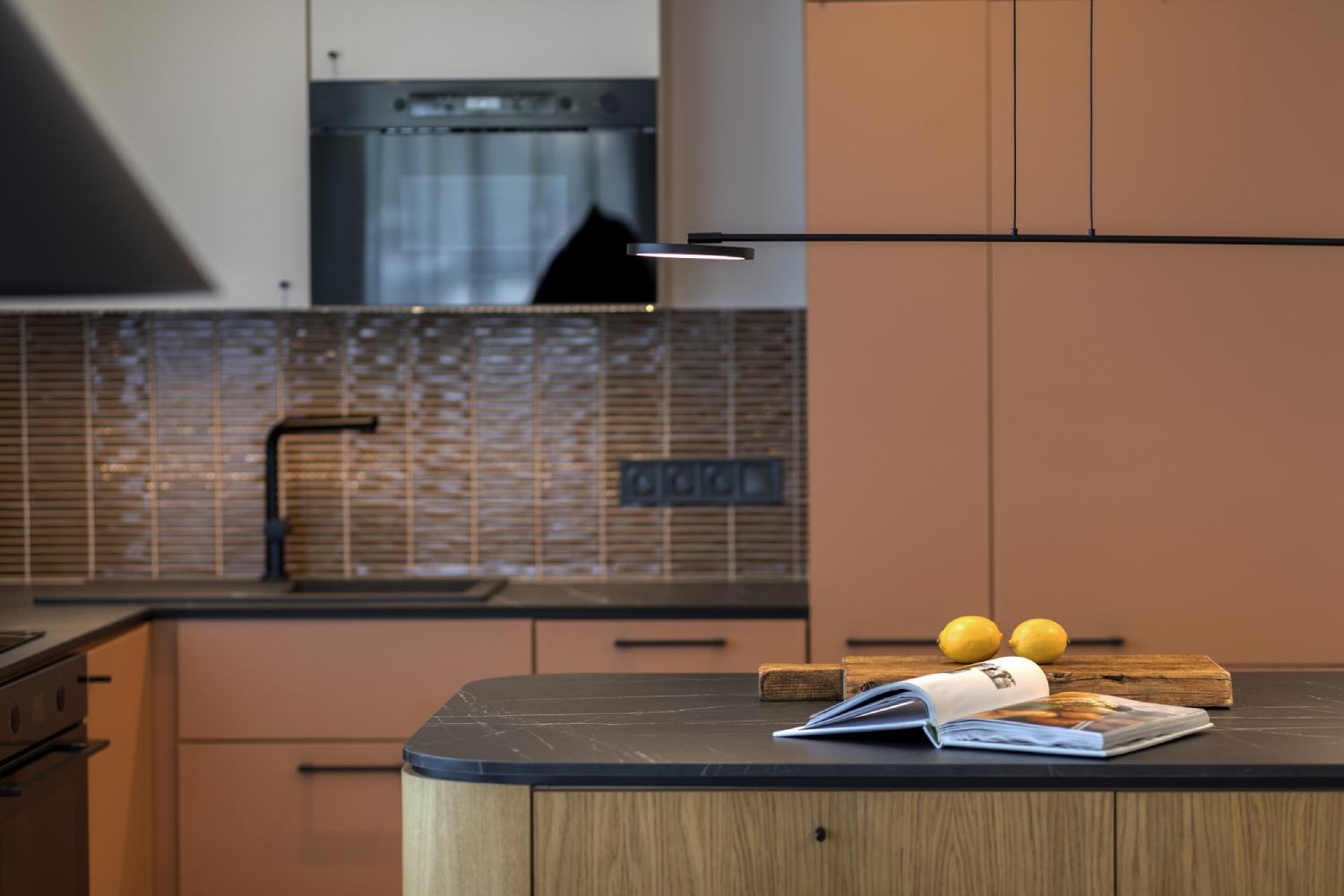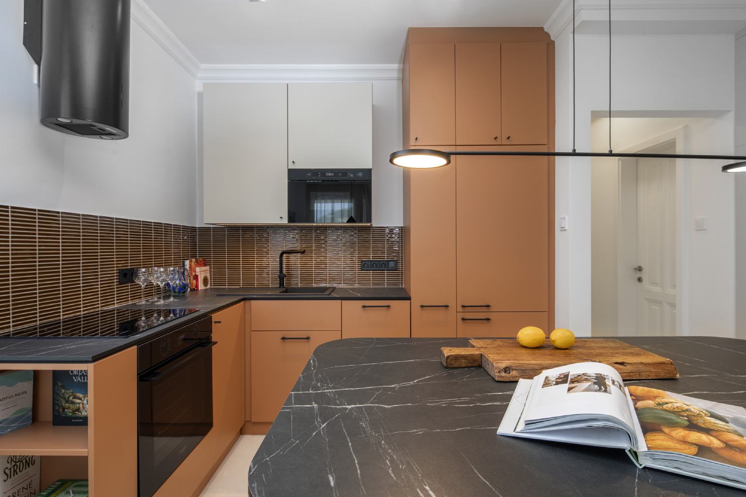 - The kitchen features beige and caramel tones on the cabinetry and upper storage units to create harmony between the kitchen and the hallway. The custom furniture, including an oak veneer island, was crafted by a carpenter based on bespoke designs.