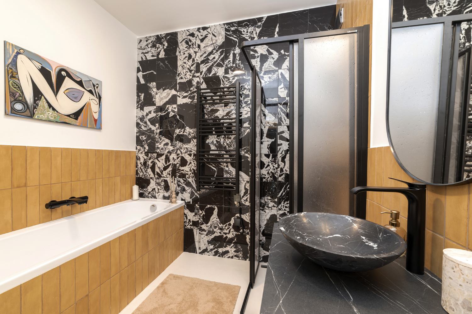 - The kitchen and bathroom are adorned with Italian tiles, elegantly combined with mustard-gold hues.