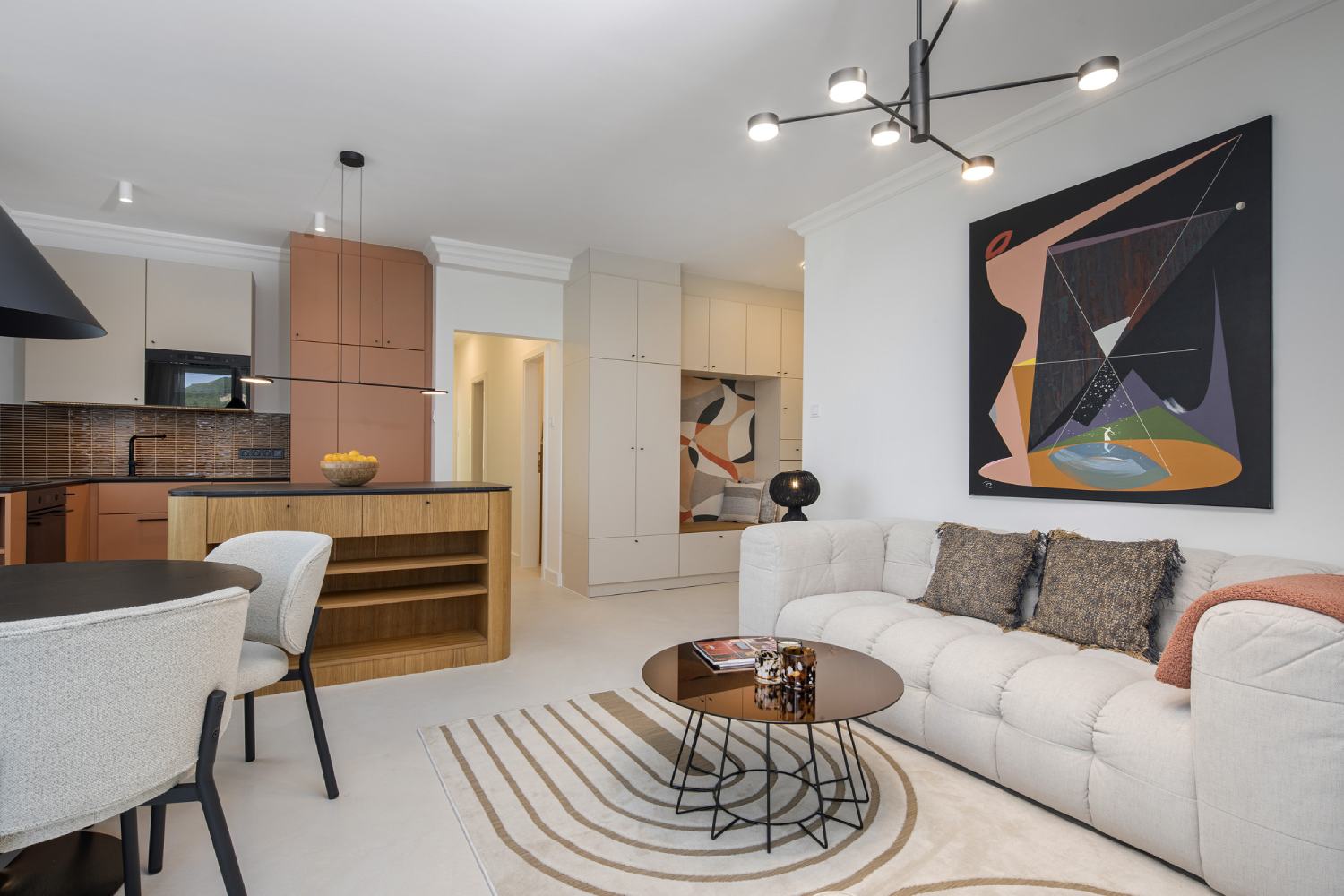- Additionally, the apartment walls are adorned with stunning works by contemporary painter Olivér Szax, further enhancing the modern, artistic ambiance and making the space even more unique and special.