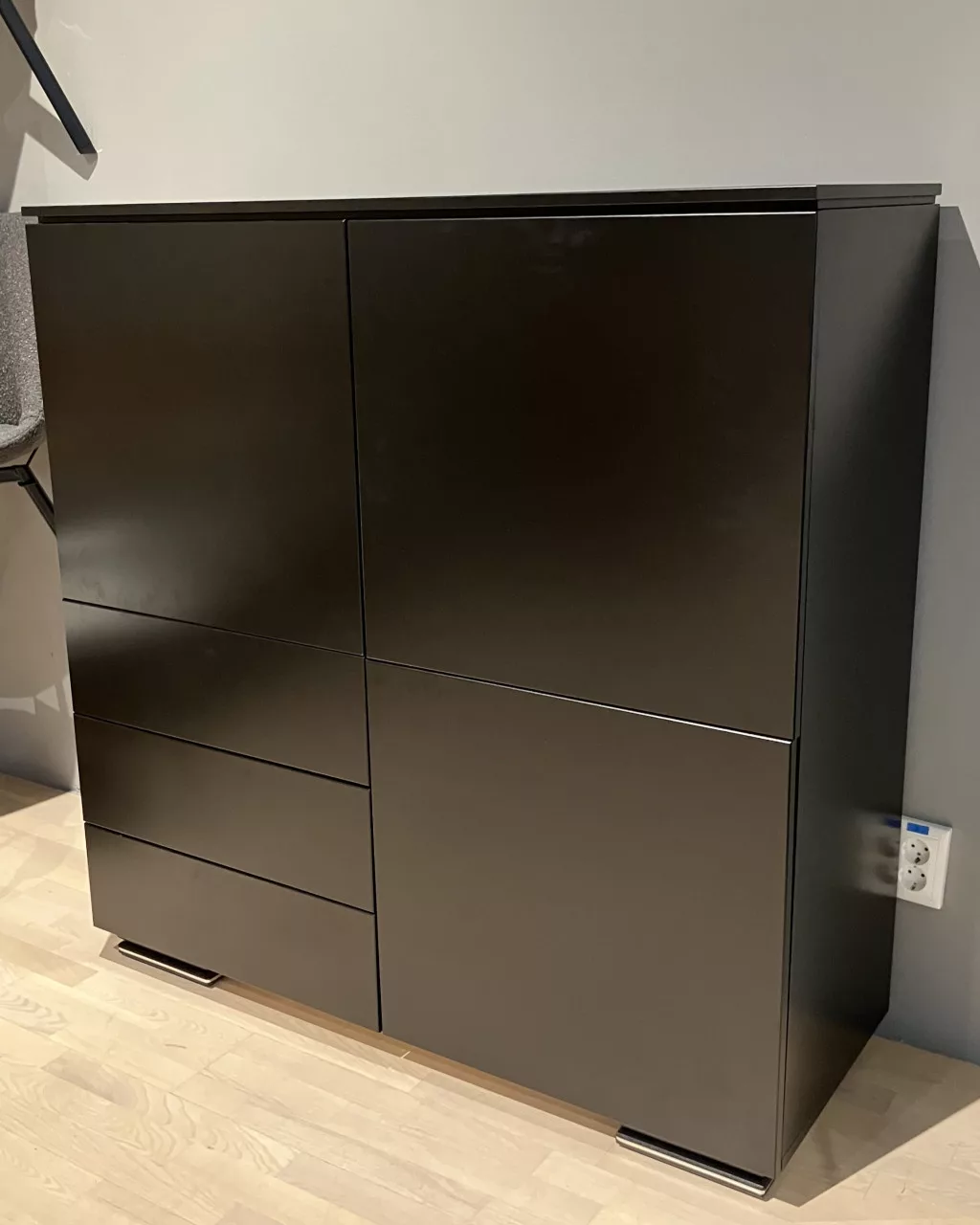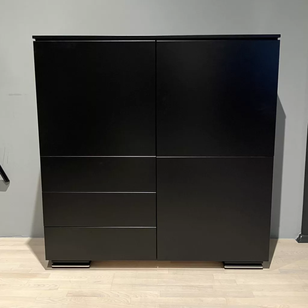 Plain magaskomód, 3 ajtós, 3 fiókos, fekete, fekete láb