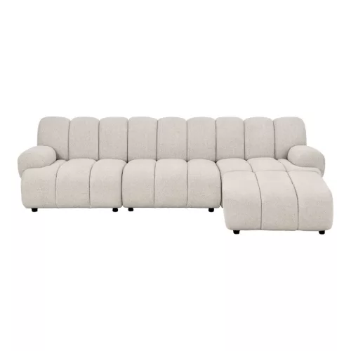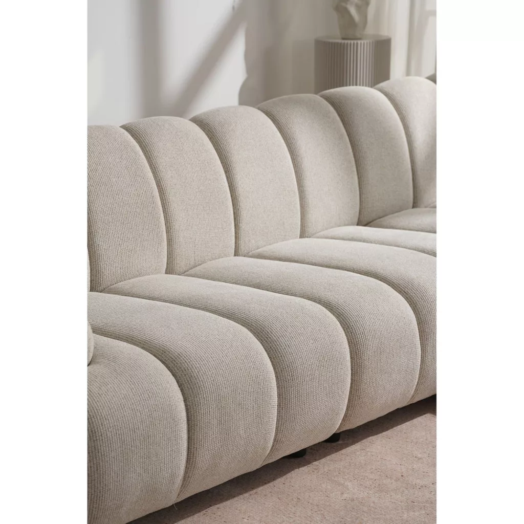 The Taza 3.5-seater sofa with pouf (right-hand) is a spacious and elegant modular seating piece that serves as the centerpiece of the living room. The sofa's sand-colored polyester upholstery gives it a clean, timeless look that easily fits into modern, Scandinavian or neutral interior design styles.