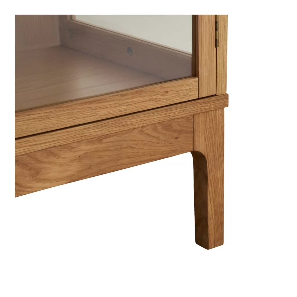 This sideboard has a clean, modern design, which, with the combination of oak veneer and glass, creates a friendly yet elegant look. The light wood effect easily fits into different interior design styles – Scandinavian, modern or timeless classic interiors. The glass shelves visually lighten the appearance of the furniture, while allowing for practical, organized storage.