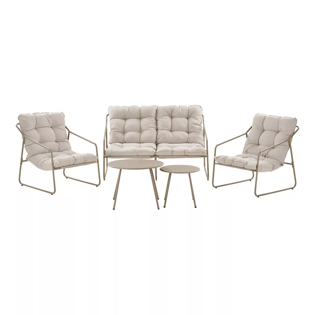 The Nilo garden furniture set is a complete outdoor lounge set in sand color, which includes a 2-seater sofa, 2 armchairs, and 2 side tables. It is the perfect choice for your garden, patio, or balcony, where you want to create a comfortable relaxation and stylish conversation area. Thanks to its sturdy steel frame and soft polyester cushions, this set is both comfortable and elegant outdoor lounge furniture.
