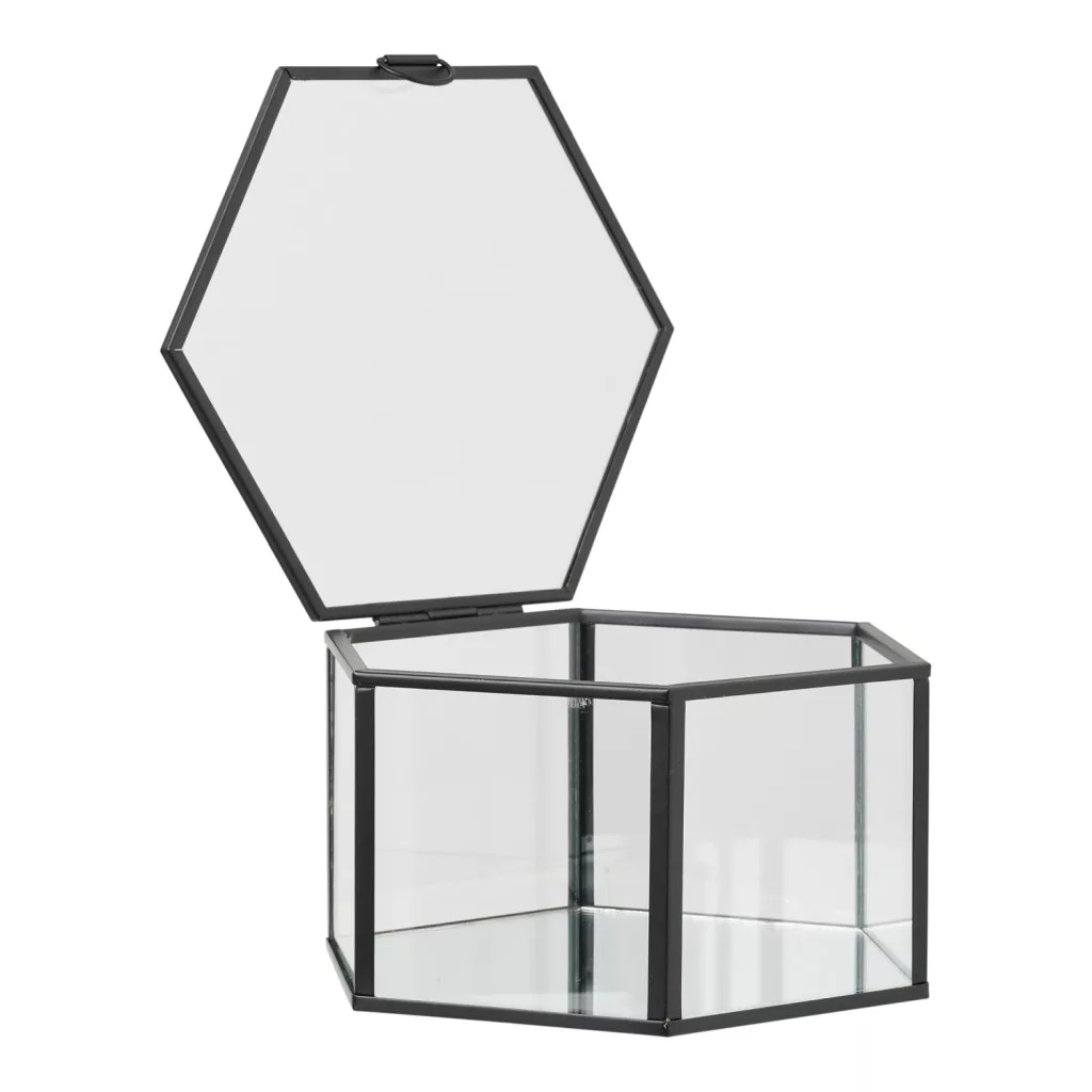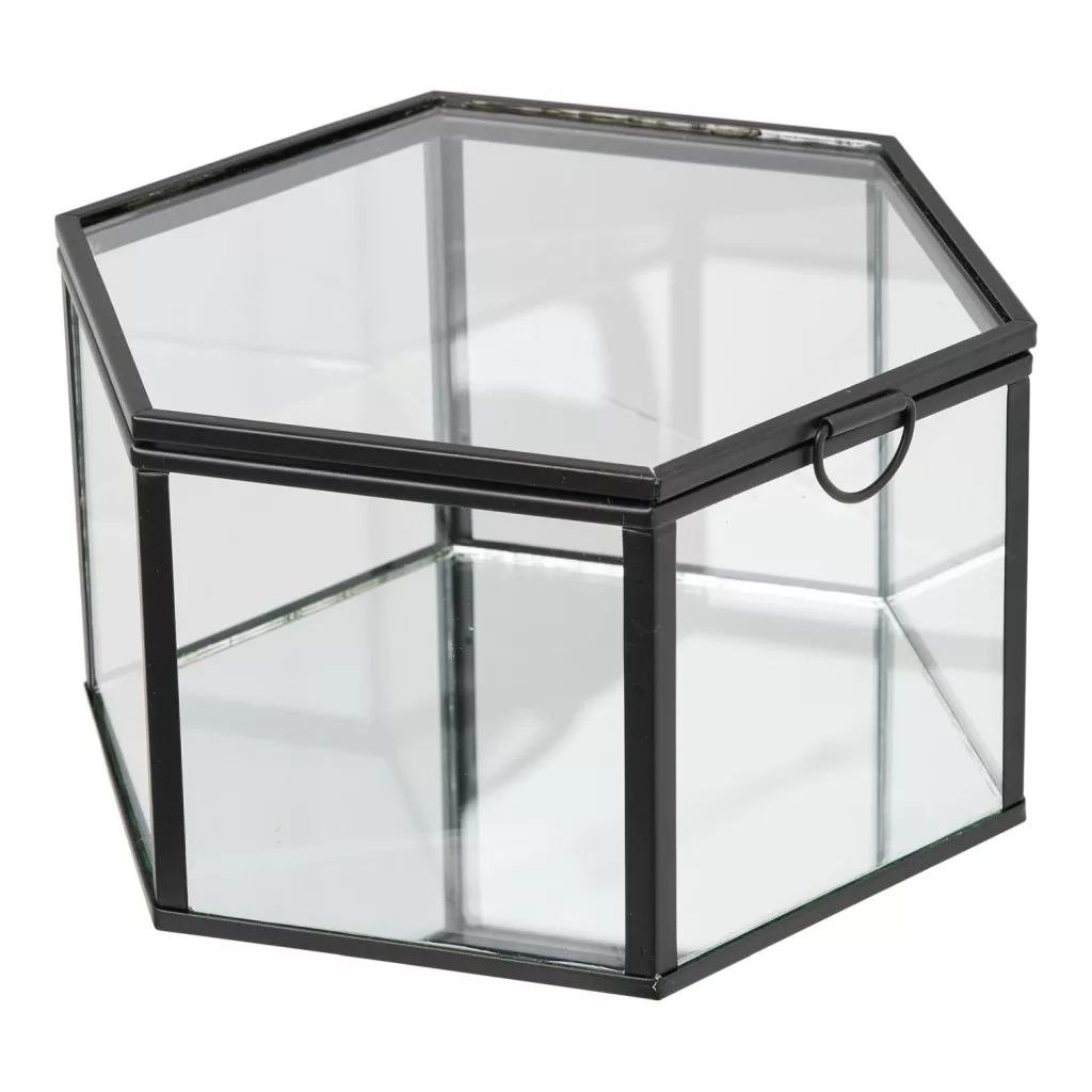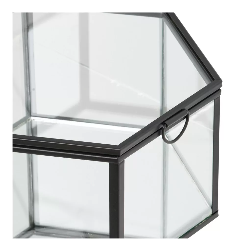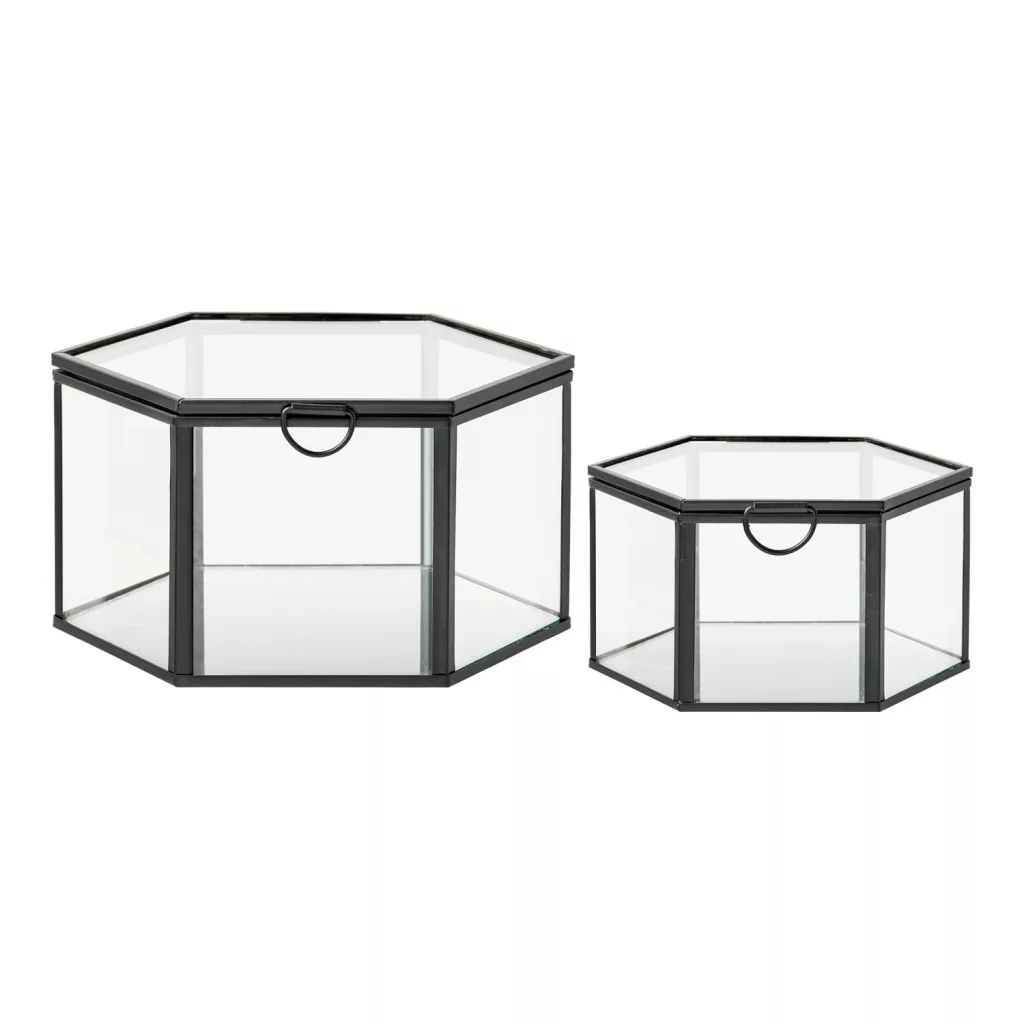 The glass walls allow the items stored inside to always be visible, while the black metal details add a clean, modern style. The set's two different sized boxes can be flexibly used in the living room, bedroom or bathroom, making them both decorative and functional.