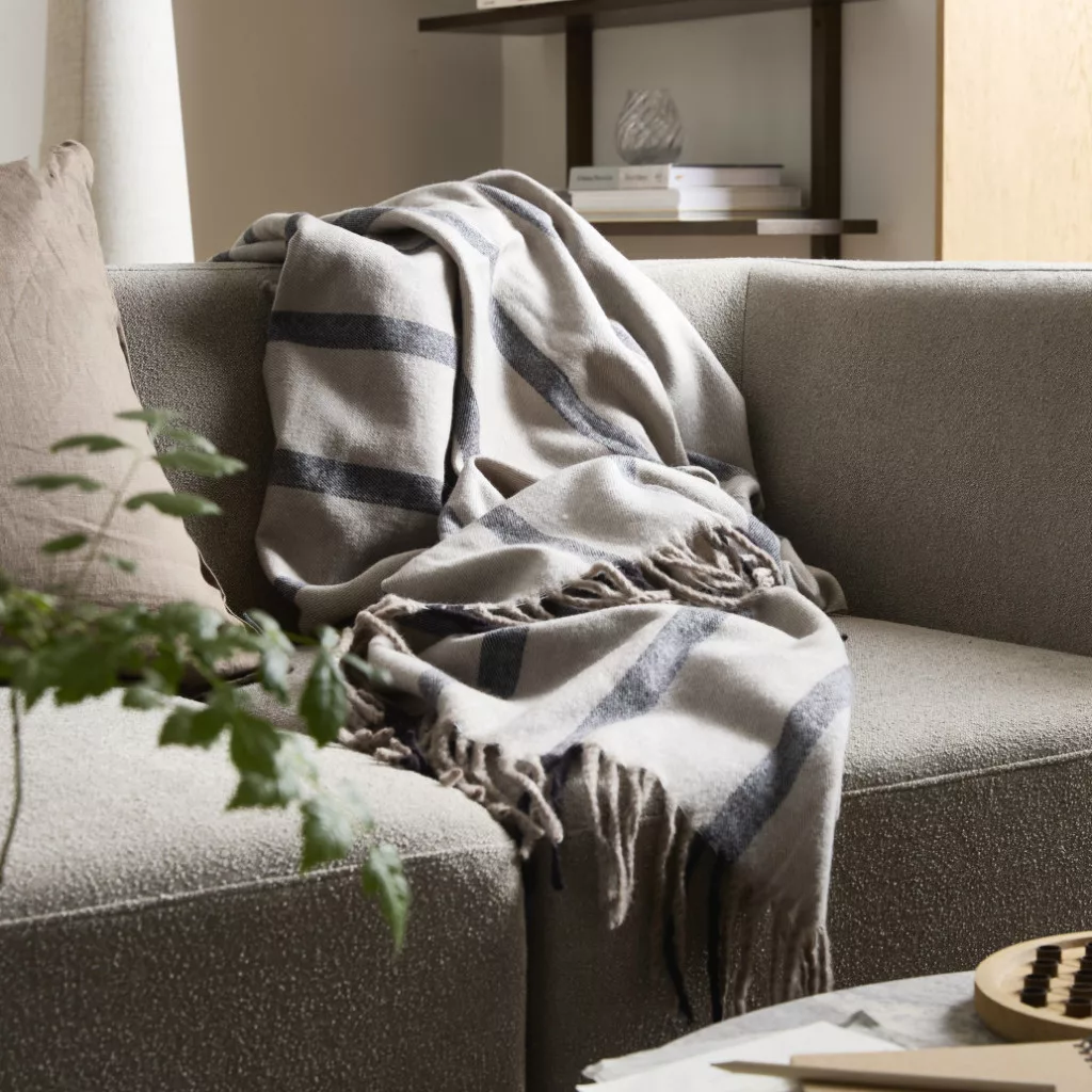 The Isklint blanket, with its soft acrylic material and warm coffee brown and sand tones, will harmoniously fit into your living room or bedroom. The delicate fringes and clean striped pattern add coziness, elegance and style to the space, while being practical and easy to use in everyday life.